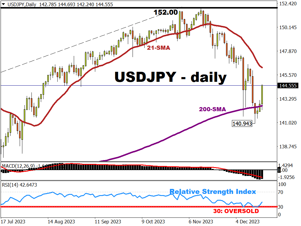 USDJPY surged above its 200-day simple moving average (SMA - a widely followed technical indicator).