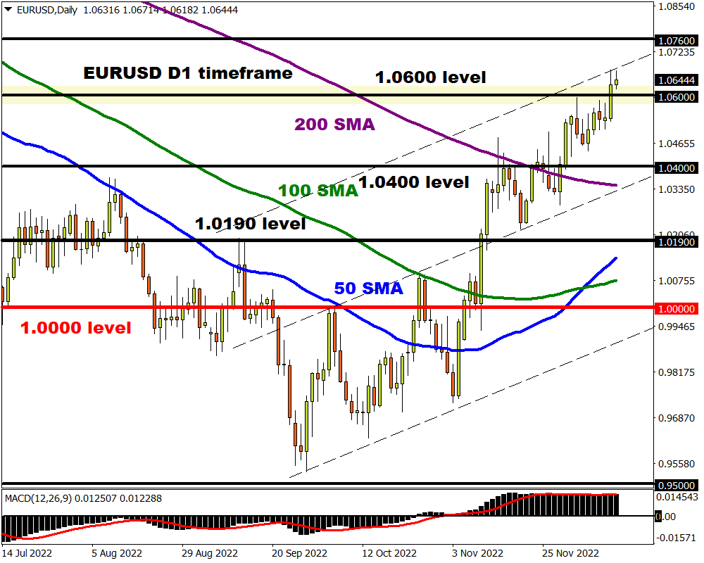 Bulls remain in firm control of the EURUSD. Not only have there been consistently higher highs and higher lows but prices are trading above the 50, 100, and 200-day SMA. The recent breakout above 1.0600 could signal an incline toward 1.0760.  A move back below 1.0600 may trigger a selloff towards 1.0460 and 1.0400, respectively.