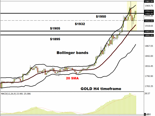 The mighty dollar is endeavouring to track higher for the first time in seven sessions after a sharp pullback in gold prices overnight and early in the European session. The yellow metal could not sustain highs above $1981 and collapsed after that new peak, before spiking lower again to $1907 on profit-taking. Bulls and bullion bank short covering have steadied the shiny ship however and we are trading above $1950 once more.
