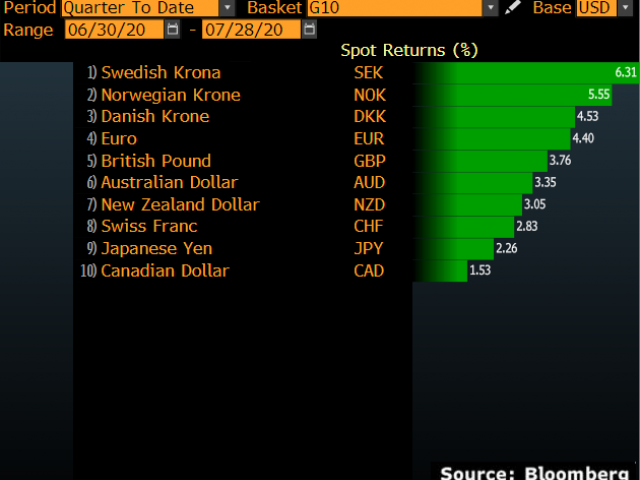 There was no love for the Dollar yesterday as sharp increases in US coronavirus cases rattled investor confidence. The once mighty Dollar has depreciated against every single G10 currency since the start of Q3 and is currently trading at levels not seen in two-years below 93.80!