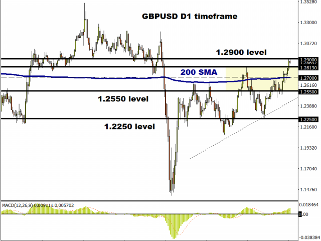 The technical picture on the GBPUSD is bullish. A solid daily close above 1.2900 could open the gates towards 1.3000. Alternatively, a technical correction from the 1.2900 resistance is seen triggering a decline back towards 1.2813 and 1.2700, respectively.