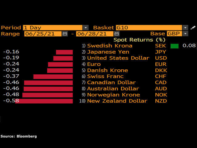 The tennis major at Wimbledon kicks off today and with many traders also glancing nervously at a certain soccer match tomorrow, minds may wander over the next few sessions! However, GBP has started the week on a strong footing (a good sign for sporting endeavours?) with the new health secretary firmly on the side of ending current restrictions as planned on 19 July. In what is a quiet week for UK data, we do get Bank of England Governor Bailey speaking on Thursday to focus the minds.