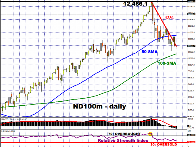 Wednesday’s US session also saw the Nasdaq 100 (NDX) posting its first daily loss so far this week, leaning further into its correction. The tech-heavy index is now 10.55 percent lower on a month-to-date basis, and has fallen by around 13 percent from its record high. The NDX also appears set on a path towards its 100-day simple moving average, although Nasdaq 100 minis are noticeably undecided about whether to extend losses at the time of writing. Still, its 50-day counterpart now provides immediate resistance.