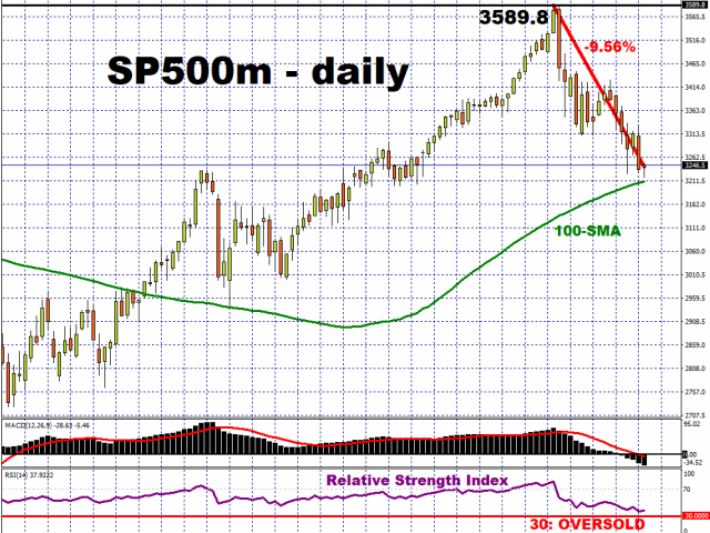 The S&P 500 is now flirting with a technical correction, which is when the price of an asset falls 10 percent or more from its recent high. The US benchmark equity index is now about 0.4 percentage points away from meeting that criteria, headed for its 100-day simple moving average (MA), with its futures flat during the Asian morning session.