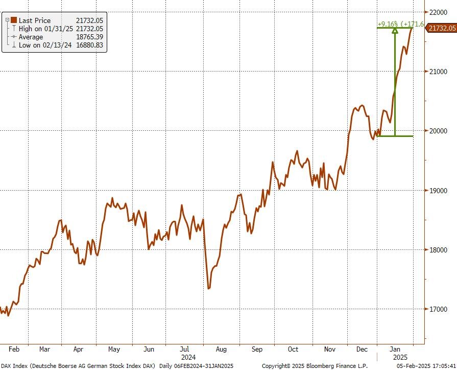 2024年DAX德指已漲了18.9%,進入新一年,德指繼續創歷史新高,至1月31日更觸及21800水平。